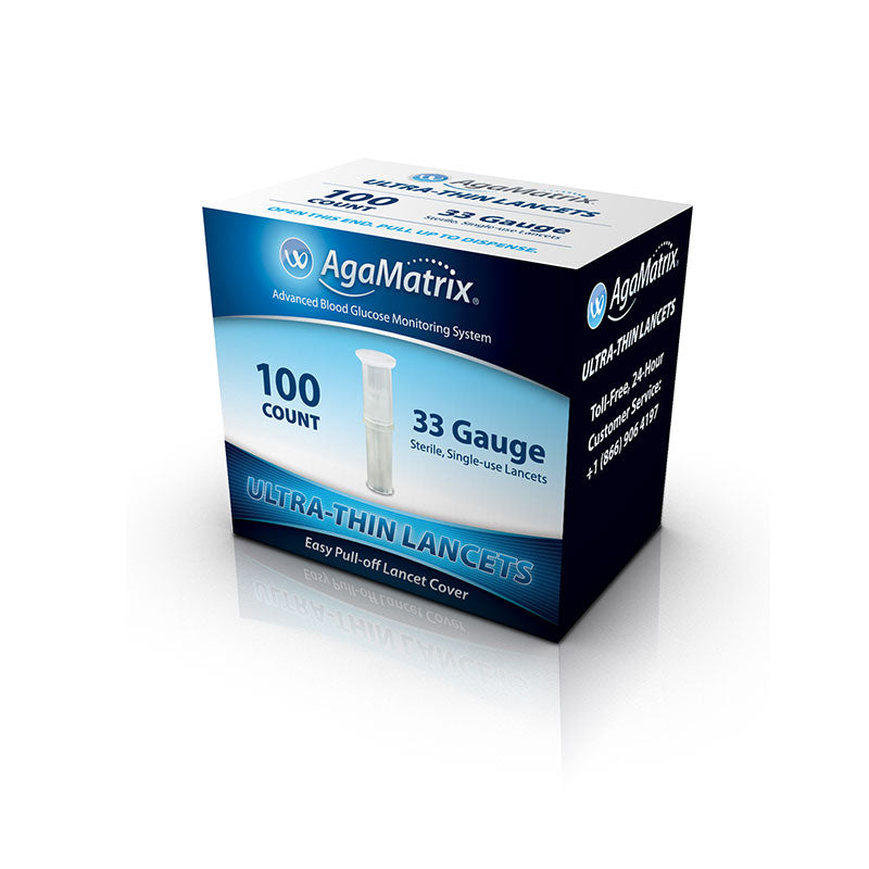 Each package contains 100 single-use AgaMatrix ultra-thin lancets.