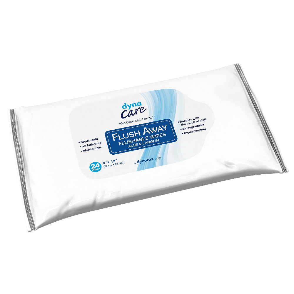 Dynarex Flushable Wipes are premium-quality, pre-moistened cleansing cloths designed to gently clean and freshen skin without the need for rinsing. Crafted from soft, spunlace materials, these alcohol-free Wipes are formulated with aloe to help soothe and moisturize skin. These convenient, disposable Wipes are crafted from biodegradable materials that break down easily after flushing for safe use with sewers and septic systems.