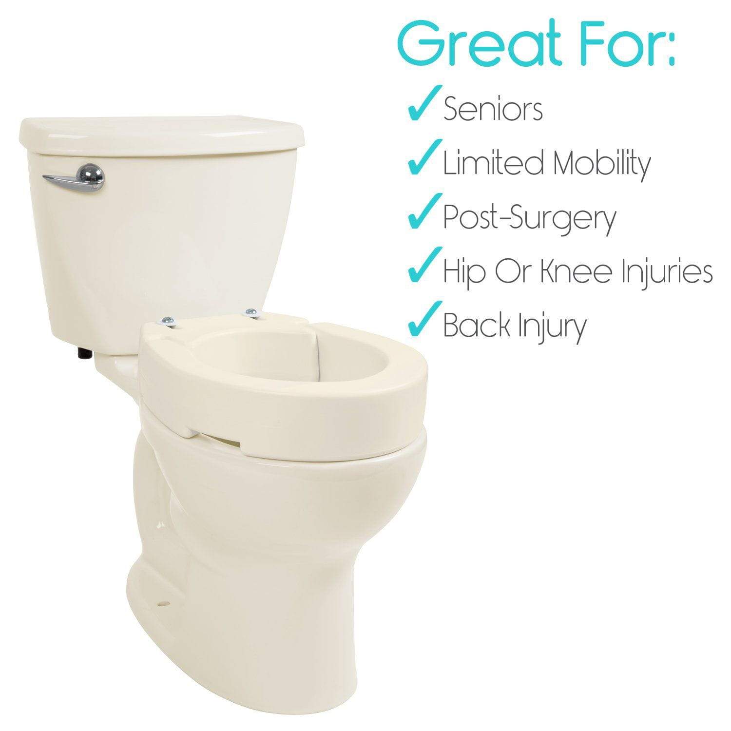 Fitting under your existing toilet seat, the hinged raised toilet seat adds 3.5” of height to the seat, making it easier to sit or stand without completely bending. The nonslip, hinged toilet seat riser is a great bathroom safety solution for the elderly, those with limited mobility and those recovering from hip, knee or back surgery. -